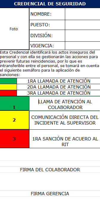 Esta es la Tarjeta de seguridad la cual cuenta con 3 espacios los cuales pueden ser perforados en caso de incumplir con alguno de los lineamientos que a continuación se te presentarán: